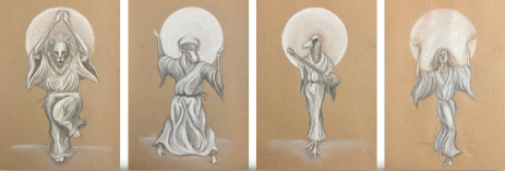 My son Toby drew the lovely images of the four faces of God that are across the top of this website. They are designed to be reminders of the joy-infused dance of the 3God, and how they are expressed by the living creatures around the throne. I’ve had them printed as a set of A5